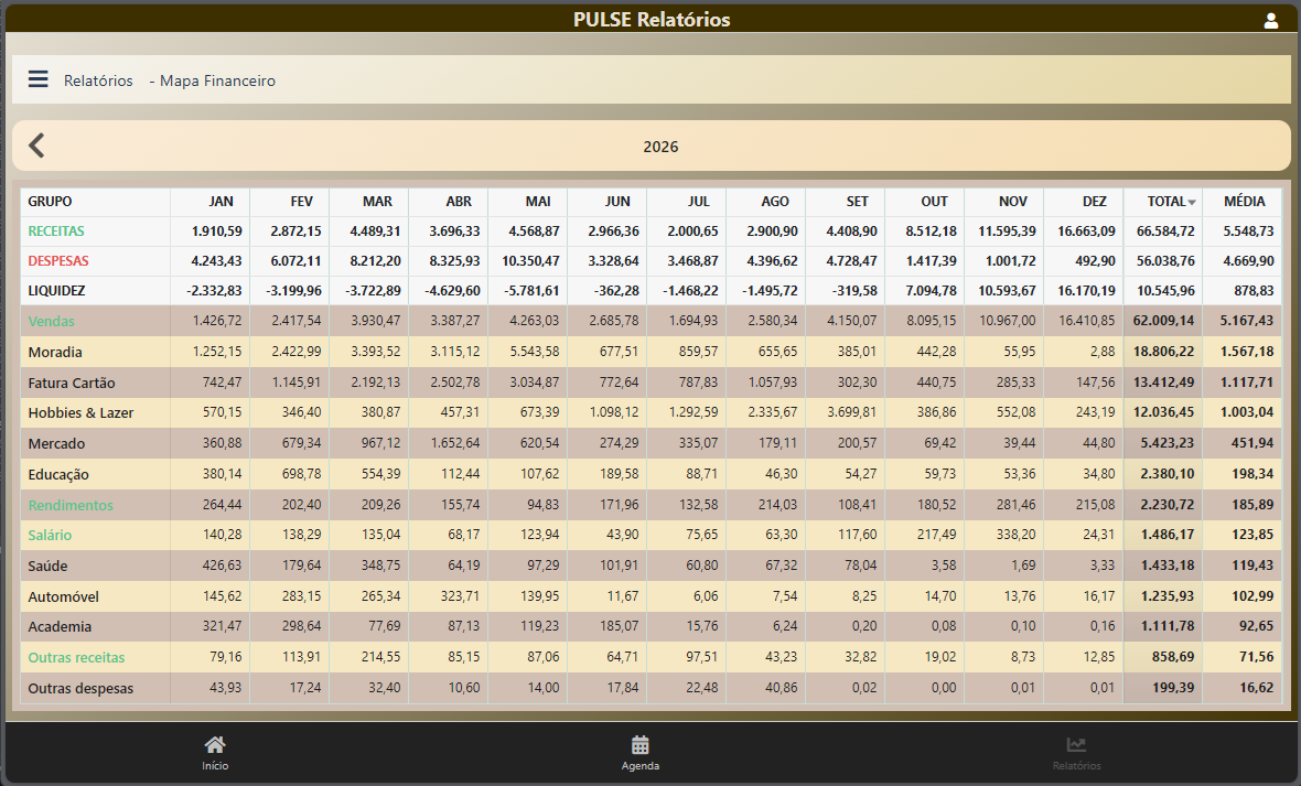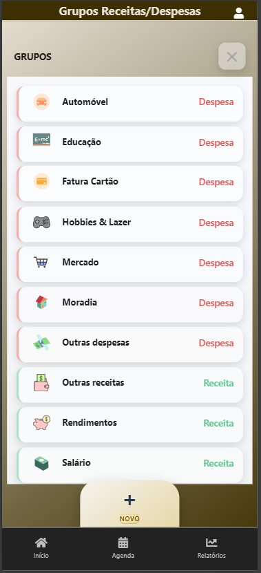 crie, edite e ajuste grupos de receitas e despesas conforme sua realidade